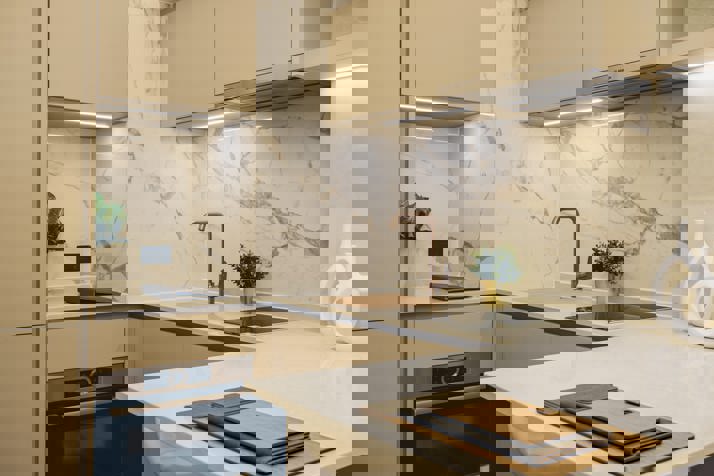 Located in the heart of Central and Sheung Wan, the complex of hotel and serviced apartments stands beside Man Wa Lane, renowned for its traditional chop-making artisans. The apartment's new design concept is a tribute to this cultural heritage, incorporating stamp frame motifs while blending Eastern and Western aesthetics. The interplay of purple and gold tones creates an ambience of refined luxury, establishing the property as a distinctive landmark in Central's dynamic landscape.